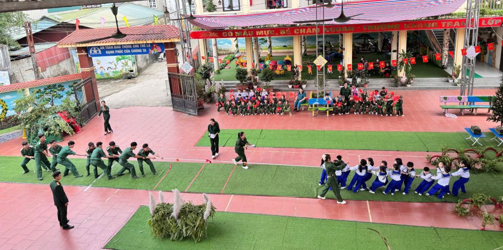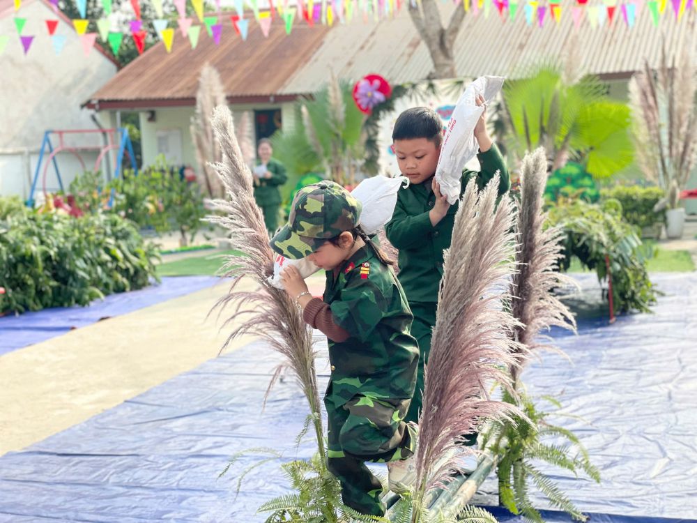 Các bé từ trường chính đến các điểm trường hào hứng tham gia nhiều hoạt động vui chơi vận động như bò chui qua hầm, vượt chướng ngại vật, mô phỏng cắm cờ hành quân... Đặc biệt, trẻ còn được giao lưu, trò chuyện thân mật, tham gia vui chơi cùng các chú bộ đội, qua đó giúp trẻ mạnh dạn, tự tin hơn.