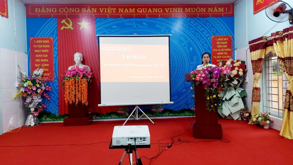 STEAM là phương pháp giáo dục tích hợp của 5 lĩnh vực bao gồm, khoa học, công nghệ, kĩ thuật, nghệ thuật, toán học. STEAM là một trong những xu hướng giáo dục chính trong thế kỷ 21. Hướng đến cho trẻ được hoạt động nhóm, trẻ được thực hành, trải nghiệm , hợp tác, được thảo luận nêu ý kiến, mạnh dạn thử nhiều lần được phép Đúng- Sai và tư duy Logic, giải quyết vẫn đề khéo léo tự kết luận cho vấn đề trẻ đang tìm hiểu. Hiểu được điều đó chiều ngày 24/3/2023 trường MN Việt Vinh đã tổ chức tập huấn hướng dẫn thiết kế bài giảng STEAM cho trẻ mầm non trong nhà trường. Qua buổi tập huấn thật sự đã mang lại nhiều kiến thức mới cho giáo viên trong nhà trường xây dựng những ý tưởng soạn giảng, lồng ghép kế hoạch, giáo án ứng dụng STEAM cho trẻ ở các môn học khác nhau phù hợp với từng độ tuổi. Xây dựng môi trường và góc STEAM của lớp hấp dẫn thu hút kích thích sự tò mò của trẻ, đồ dùng phong phú về nguyên liệu, mang tính an toàn thẩm mỹ, sắp xếp khoa học thuận tiện cho trẻ hoạt động, vui chơi phát triển toàn diện về Đức - Trí - Thể - Mỹ.