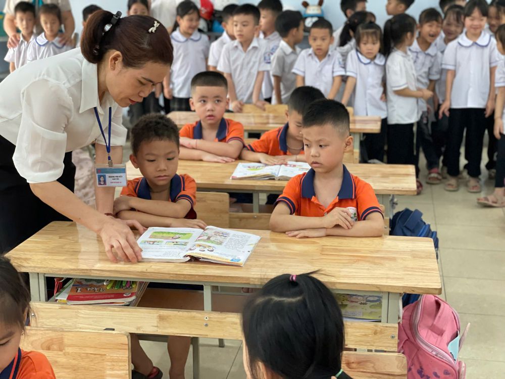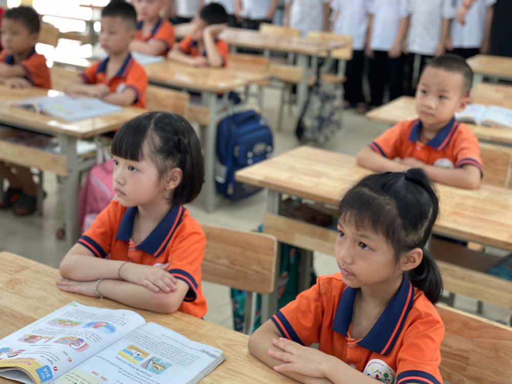 Trong không gian mới mẻ, các con chăm chú quan sát cách học của các anh chị, lắng nghe cô giáo lớp 1 trò chuyện và chia sẻ về những điều thú vị ở bậc tiểu học.