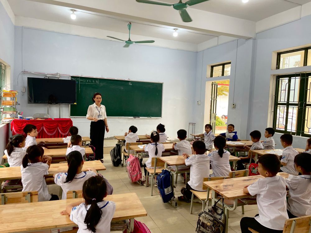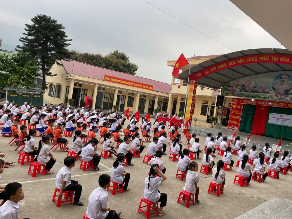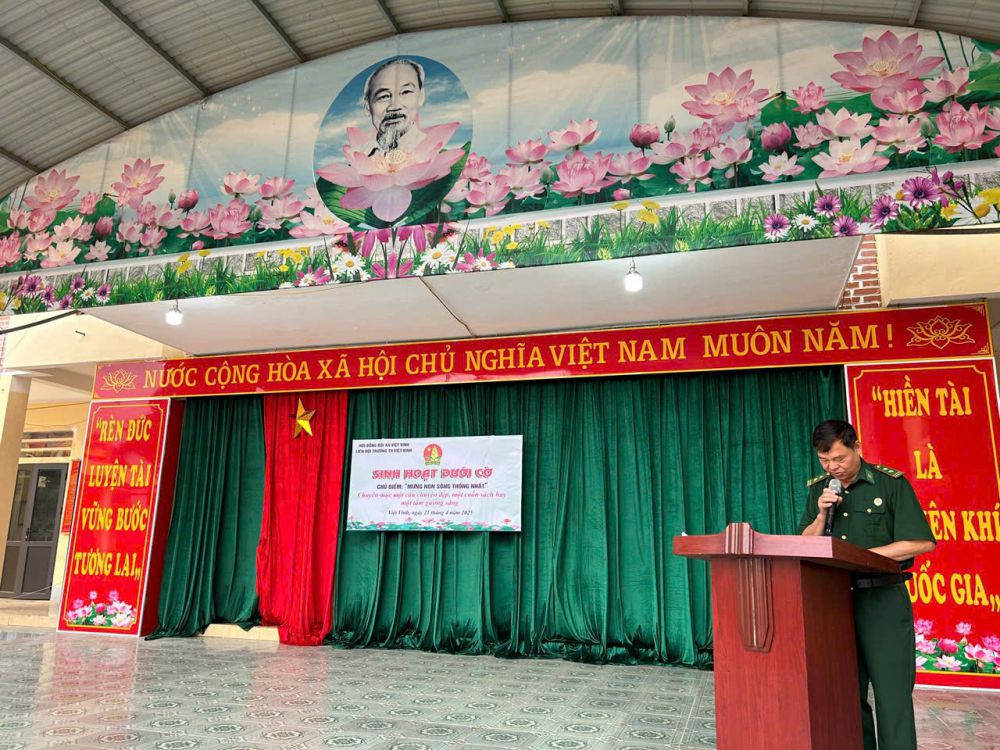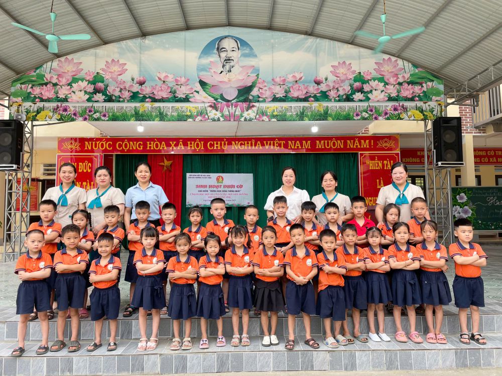 Trong không khí trang nghiêm của buổi lễ, các bé cùng các anh chị học sinh trang nghiêm chào cờ, hát Quốc ca, lắng nghe những lời nhắn gửi từ thầy cô, đặc biệt là phần ôn lại truyền thống hào hùng của dân tộc ta qua lời kể xúc động và chân thực của ông Nguyễn Xuân Quán – Phó Chủ tịch Hội Cựu chiến binh xã Việt Vinh.